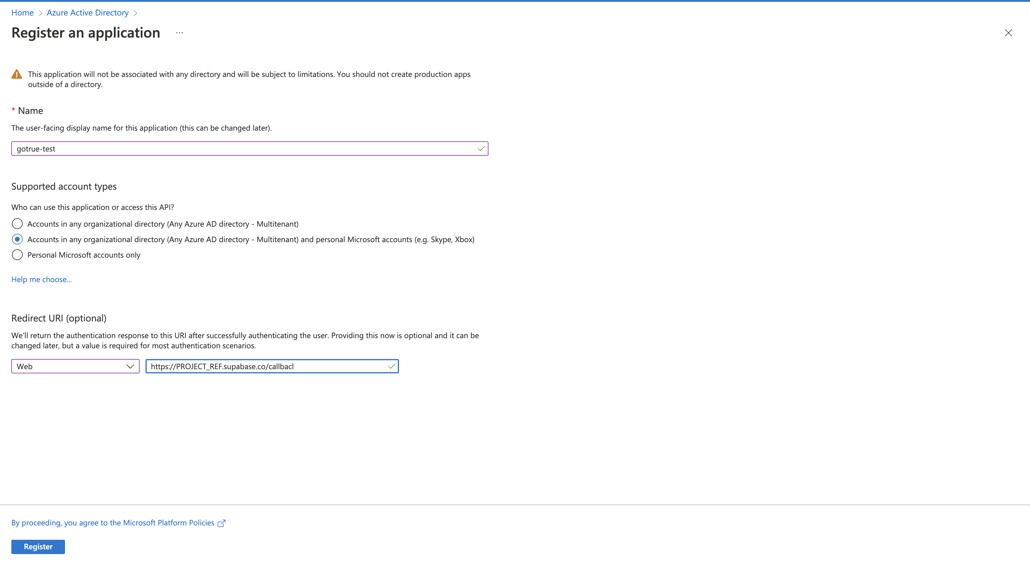 https://<project-ref>.supabase.co/auth/v1/callback - Finally, select Register at the bottom of the screen.